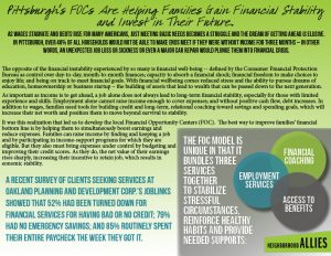 We launched three local Financial Opportunity Centers (FOCs) based on a successful national model of bundling three services together for long-term improvements in income, wealth and credit. Employment services, financial coaching and access to income supports (benefits) are combined to help families to increase wages, access benefits, build credit and reduce expenses – leading to positive cash flow and the ability to cover basic household expenses and begin to save for emergencies and future goals.